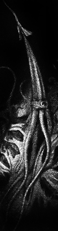 L’œil cherche sans cesse à identifier un sujet, nous pousse de manière irrépressible à associer similitudes et différences, à ordonner les formes, à rechercher un fil conducteur parmi elles, de manière à établir des débuts d’explication. Ce regard balaye les visions nocturnes, s’accroche à un visage, une épaule, un étrange grouillement organique, qui fait surgir un corps des abysses ou l’y noie. Sur ces images le spectateur circule, revient, s’étonne et s’illumine un instant, croyant percer un mystère, qui s’évanouit aussitôt, happé par l’ombre.