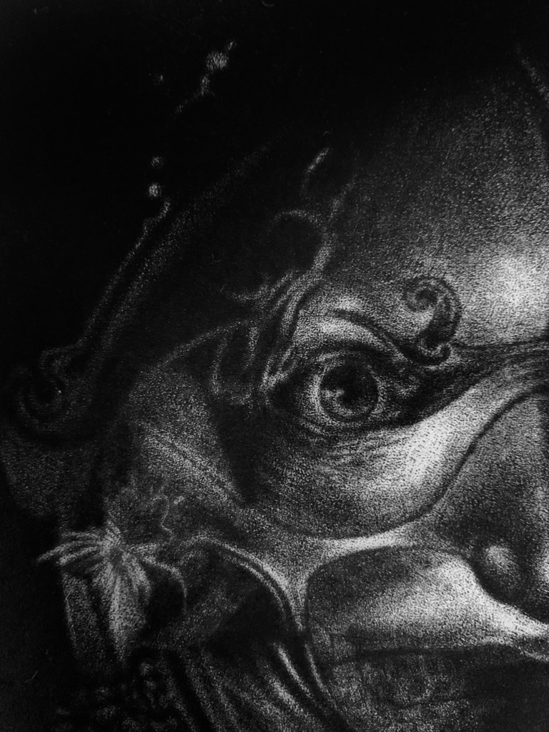 Parmi les techniques diverses de la gravure, la manière noire est sans doute l’une des plus exigeantes et virtuoses. Elle sollicite force physique, patience, imagination, capacité d’anticipation, précision, délicatesse et nuance. Comme toutes les techniques riches de possibilités, elle requiert de la part de l’artiste, les qualités d’un bon cavalier, capable de lâcher la bride à son imaginaire tout en le tempérant au moment opportun.