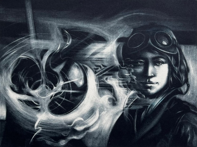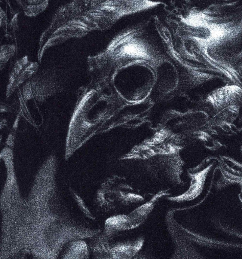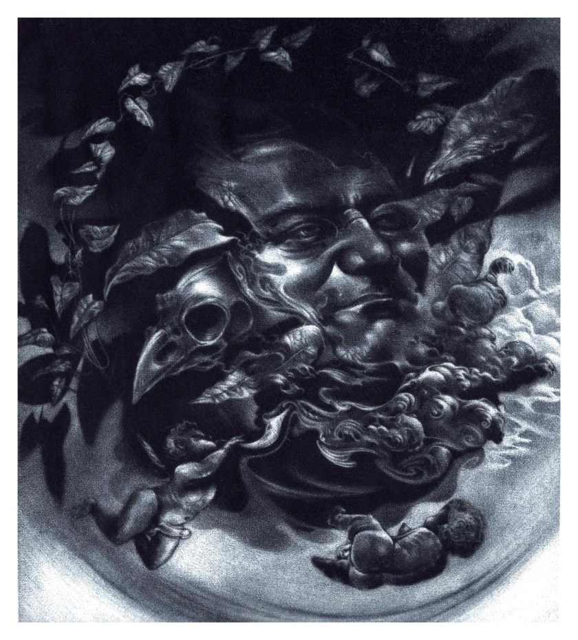 Dans cette vision, une couronne végétale auréole Monselet, la tête perchée dans son capiteux nuage de convictions. Une tête d’oiseau à l’architecture osseuse baudelairienne, témoigne de la vanité humaine, en évoquant sa mortalité tant de sa chair que de sa gloire. Un angelot, tendu par l’effort à produire pour émettre un son hors d’un cor céleste, baguenaude dans un ciel en compagnie d’une chérubin-e aptère sensible à l’aura générée. Un firmament troublé par la vapeur sirupeuse émanant de l’instrument de la renommée, sature en de tendres nuages moutonneux son souffle érectile.