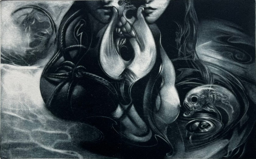 - épicer les voluptés (21/19) 2022, gravure réalisée dans le cadre d’une collaboration avec l’atelier « Graver Maintenant » (Paris).